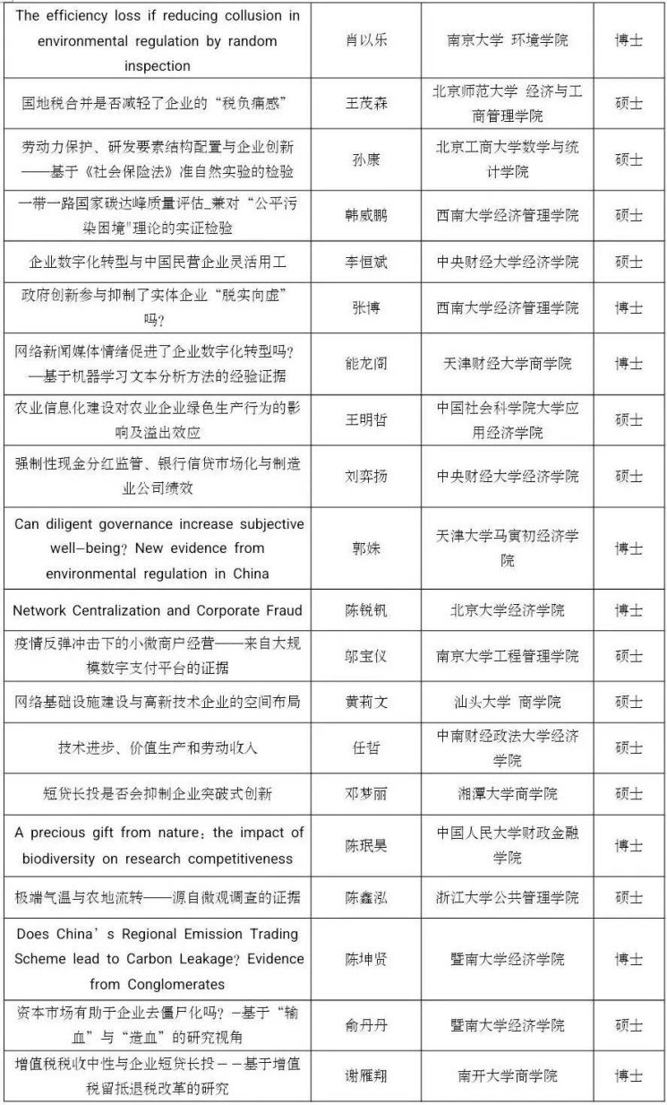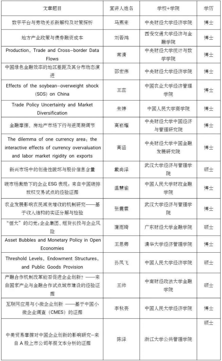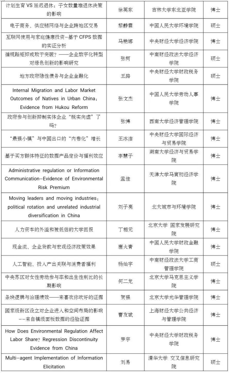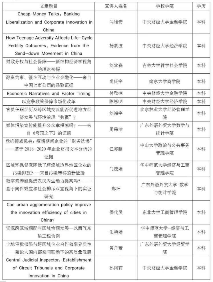 党的二十大报告指出,“教育、科技、人才是全面建设社会主义现代化国家的基础性、战略性支撑”。为了学习、贯彻和落实党的二十大关于教育和人才建设的精神,必赢国际437官网联合中国经济学年会、中国青年经济学家联谊会主办第五届未来经济学家论坛。本论坛坚持“公平、公正、公开”的原则,鼓励思想争鸣、学术创新,旨在为未来有志于从事经济学研究的全国高校在校学生(本科生和研究生)提供一个观点交流、思想碰撞的学术交流平台。本次论文征集环节共收到612篇投稿论文,经过评审论证和评审,最终遴选出126篇入围会议,名单如下,恭喜各位入选的同学: