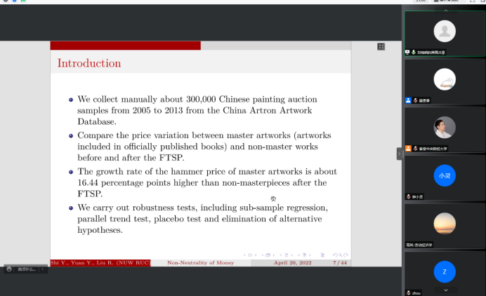 2022年5月12日14:00,中国人民大学国家发展与战略研究院教授、博士生导师刘瑞明应必赢国际437官网邀请,开展主题为“Non-Neutrality of Money:Money Supply Shock and Masterpiece Effect in Art Market”的讲座,本次讲座通过腾讯会议平台线上举行,刘瑞明老师受到了老师和同学们的热烈欢迎!必赢国际437官网黄乃静副教授主持了线上学术交流会,陈斌开院长、尹振东教授与2020级博士生共同参与了本次学术交流。
