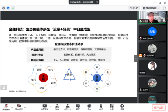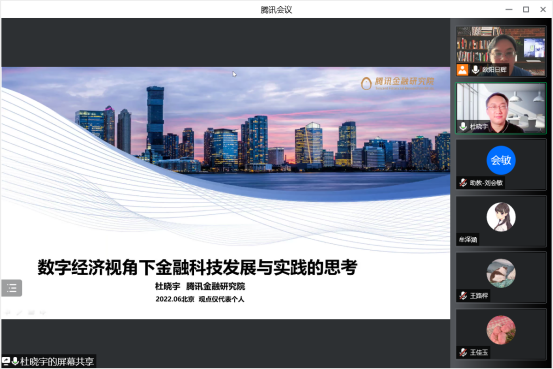 2022年6月20日上午10点,腾讯金融研究院秘书长杜晓宇应邀加入必赢国际437官网“数字金融理论与实务”线上课堂,以“数字经济视角下金融科技发展与实践的思考”为题,为同学们带来了一场精彩纷呈的讲座。