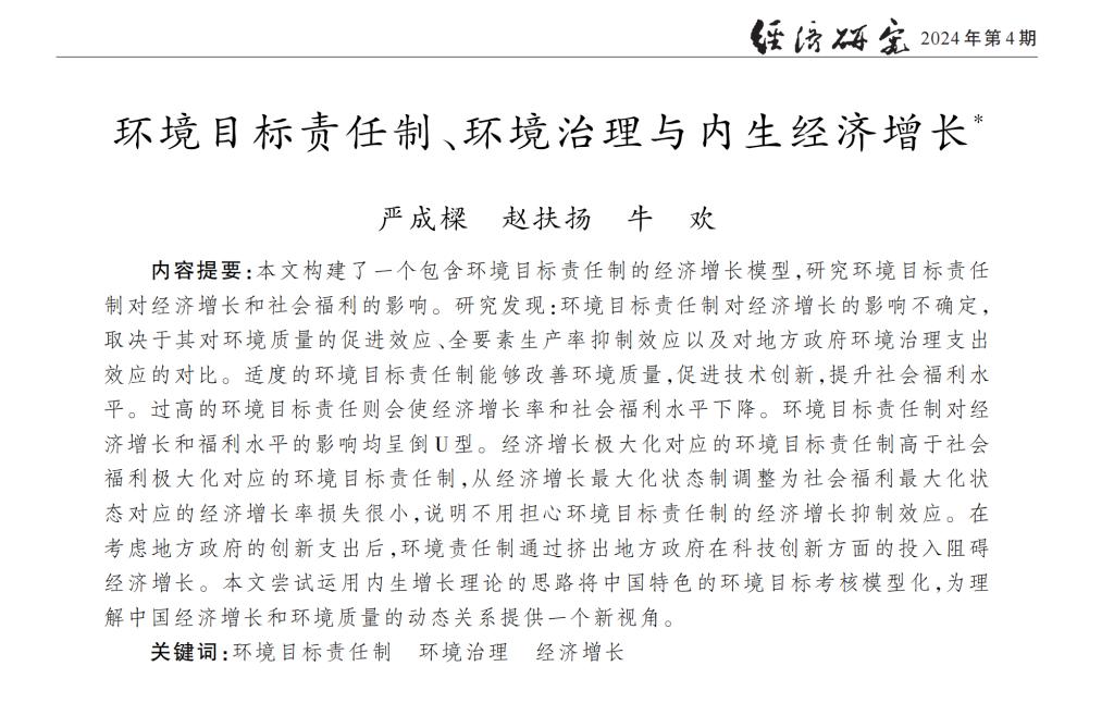 更多精彩内容请查看原文:严成樑、赵扶扬、牛欢:《环境目标责任制、环境治理与内生经济增长》,《经济研究》2024年第4期;