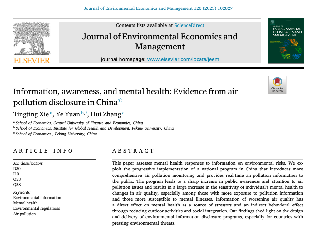 学术视点 | 必赢官网谢婷婷老师的合作论文《Information, awareness, and mental health: Evidence from air pollution disclosure in China》在国际顶级期刊Journal of Environmental Economics and Management接受发表