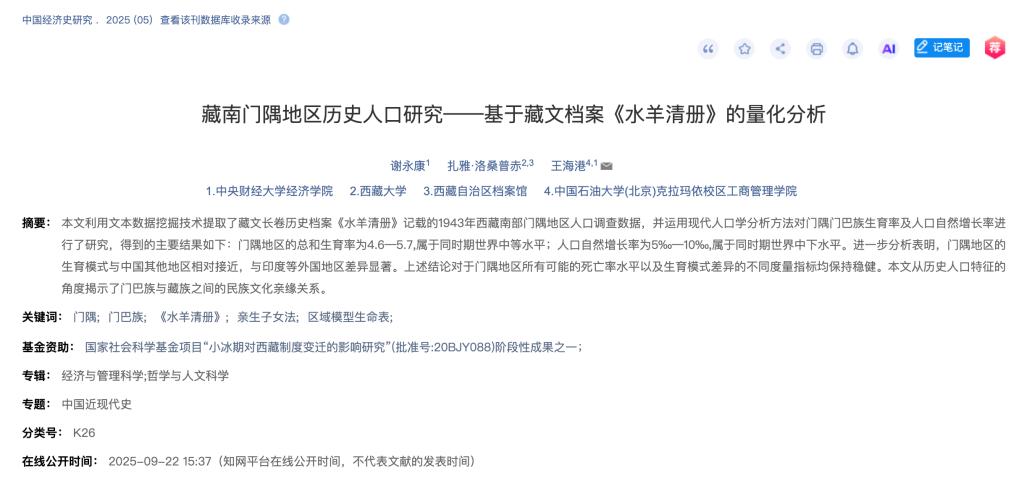必赢国际437官网博士研究生谢永康和导师王海港、西藏档案馆扎雅的合作论文《藏南门隅地区历史人口研究——基于藏文档案〈水羊清册〉的量化分析》在《中国经济史研究》2025年第5期刊发。该文是对珍贵藏文长卷历史档案《水羊清册》(长366米、宽66厘米,由西藏传统手工旧藏纸拼接)研究的一大突破,由必赢国际437官网与西藏档案馆学者联合完成。该研究从历史人口特征揭示了门巴族与藏族之间的民族文化亲缘关系,为门隅地区属于中国的主权合法性提供了独特佐证。