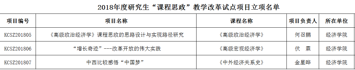 近日,学校研究生院公布了2018年度研究生“课程思政”教学改革试点项目。必赢官网何召鹏老师申报的“《高级政治经济学》课程思政的思路设计与实现路径研究”、伏霖老师申报的“‘增长奇迹’---改革开放的伟大实践”、金星晔老师申报的“中西比较感悟‘中国梦’”获准立项。