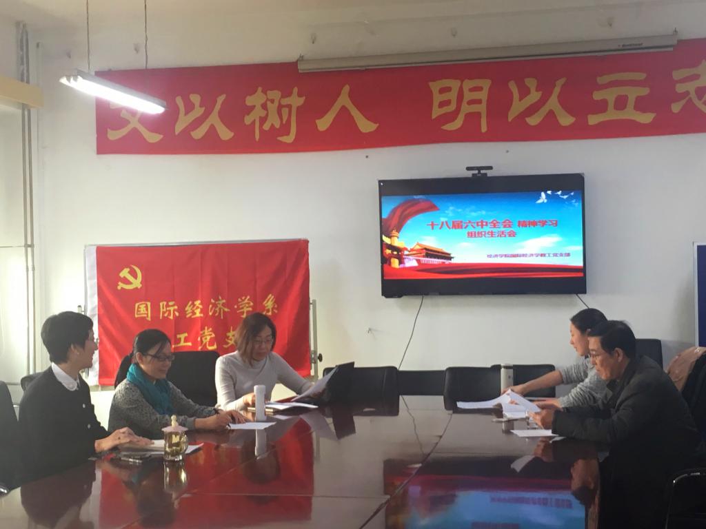 12月21日中午,必赢国际437官网国际经济学教工党支部4名党员在学院南路校区1305会议室组织十八届六中全会、全国高校思想政治工作会议精神专题学习,学习研讨了习近平总书记《把思想政治工作贯穿教育教学全过程》的重要讲话。专题学习由党支部副书记赵若思同志主持,必赢国际437官网党委书记雷洪峰列席会议。