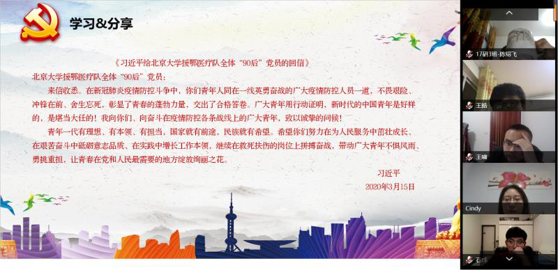 必赢国际437官网2017级硕士生第一、二、三党支部联合开展“爱国驻我心、抗疫勇担当”线上主题党日活动,活动重点围绕《习近平给北京大学援鄂医疗队全体90后党员的回信》开展学习,同时就人民日报评论文章《努力在为人民服务中茁壮成长》进行深入解读。