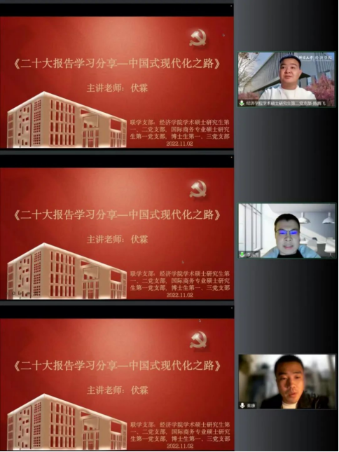 2022年11月2日,必赢国际437官网党委委员、副院长伏霖为必赢国际437官网学术硕士研究生第一、二党支部,国际商务专业硕士研究生第一党支部,博士生第一、三党支部作主题为“二十大报告学习分享——中国式现代化之路”的专题讲座。博士研究生第三党支部书记冯博主持活动,80余位师生党员及入党积极分子线上参加。