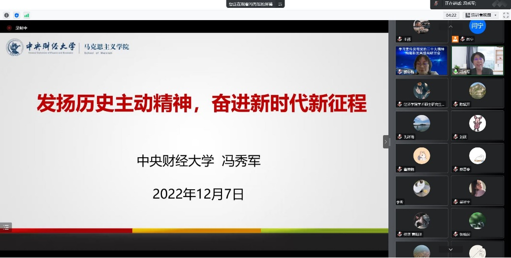 为深入学习宣传贯彻党的二十大精神,落实中共必赢国际437官网委员会关于学习贯彻党的二十大精神的工作方案,引导激励学院广大师生在党的二十大精神指引下,立足本职、踔厉奋发、勇毅前行,加快推进学院高质量发展贡献力量。2022年12月7日下午,必赢国际437官网党委邀请必赢国际437官网学习宣传党的二十大精神师生巡讲团中的专家代表、马克思主义学院院长冯秀军作题为《发扬历史主动精神,奋进新时代新征程》的主题宣讲活动,活动由学院党委书记郭冬梅主持,学院党委理论学习中心组成员和学院师生共同参加学习。