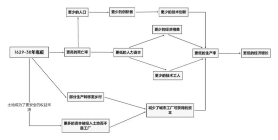 瘟疫是对健康的冲击,很多文献的实证结果表明瘟疫对经济发展的长期影响是负向的,主要的通过影响劳动生产率、长期投资、人力资本积累的渠道。首先,“疫病”给劳动者身体和心理造成直接冲击,降低了劳动生产率,进一步会影响劳动者教育和抑制创新,降低了全要素生产率方面更高的生产效率。不好的健康环境也降低了资本积累的速度,进一步减低了生产效率;其次,“疫病”的频发发生或者公共卫生状况不好,不利于长期投资,实证显示成人死亡率高的国家,长期投资更少;最后还有人力资本积累,“疫病”可能会带来预期寿命的降低,降低了教育回报率,人们越不愿意积累人力资本,同时还提高了教育投资的折旧。推荐一篇比较新的文章,Alfani and Percoco(2019)在《Economic History Review》上,以1629-1630年意大利大瘟疫为例,从生产率冲击的角度证明了瘟疫对经济会产生长久且负面的影响,主要的影响机制如下图所示。