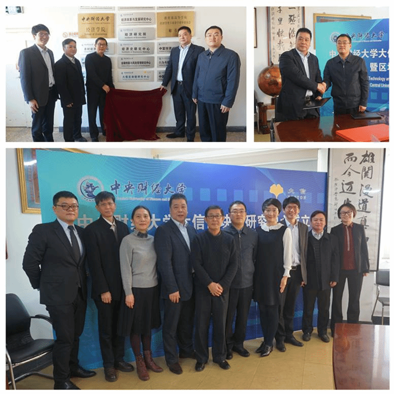 上午11时,黄强董事长代表大信金融集团、李涛院长代表必赢国际437官网在战略合作框架协议上签字并交换文本。黄强董事长、李涛院长、陈斌开副院长、金哲松教授、顾炜宇副教授共同为“大信区块链研究中心”揭牌。必赢国际437官网大信区块链研究中心正式成立。