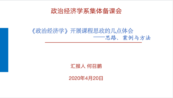随后,何召鹏老师从《政治经济学》开展课程思政的思路及具体方法两个维度重点汇报了如何在《政治经济学》课程教学中开展思政教育。他指出,课程思政的关键是专业课程中,加入思政素材、实现“知识传授”和“价值引领”有机统一。最大程度发挥课程思政育人效果的关键是实现专业课程与思政元素的有机融合,包括思政元素与专业基础理论的有机融合、与专业热点问题的有机融合以及与学生专业兴趣的有机融合,最终实现专业课程教学与思政教育相互促进。在两者的良性互动中,提升当代大学生对中国特色社会主义的认同感和参与度,培养合格的社会主义建设者和接班人。
