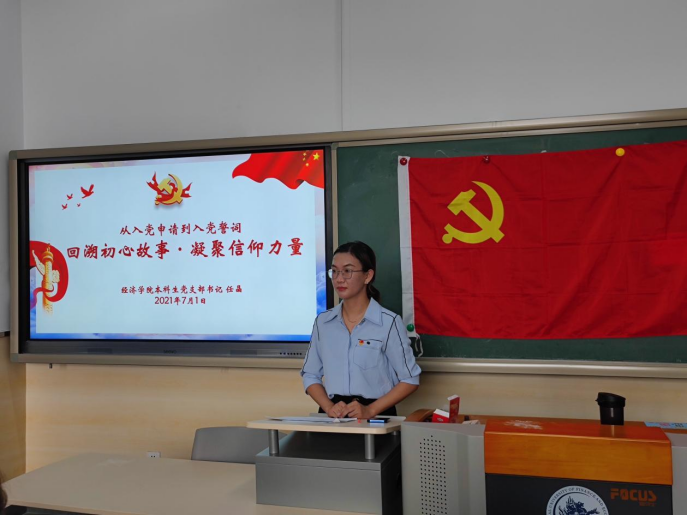 宣誓仪式后,任晶老师主持召开了以“从入党申请到入党誓词|回溯初心故事·凝聚信仰力量”为主题的党史学习教育专题党课。任老师首先通过展示老一辈革命先烈的入党申请书原件,带领同学们重温共产党人的初心使命与对党的深情,随后她梳理了入党誓词的历史源起和严革变迁,回顾了不同历史时期、不同的革命形势下入党誓词的内涵。入党誓词的沿革反映了我们党从不放松党的建设、高度重视对党员进行党性教育和理想信念教育,反映了我们党善于把握不同历史时期的主题和要求来发展党员、具有与时俱进的先进性。最后,任老师对新发展入党的党员们提出了要求:“希望同学将来不论担任何种职务、从事何种工作,都要明白自己是一名在党旗下宣过誓的共产党员,用入党誓词约束自己,把入党誓词各项内容落实到行动上、落实到各项事业中,切实做到为党分忧、为国尽责、为民奉献。”