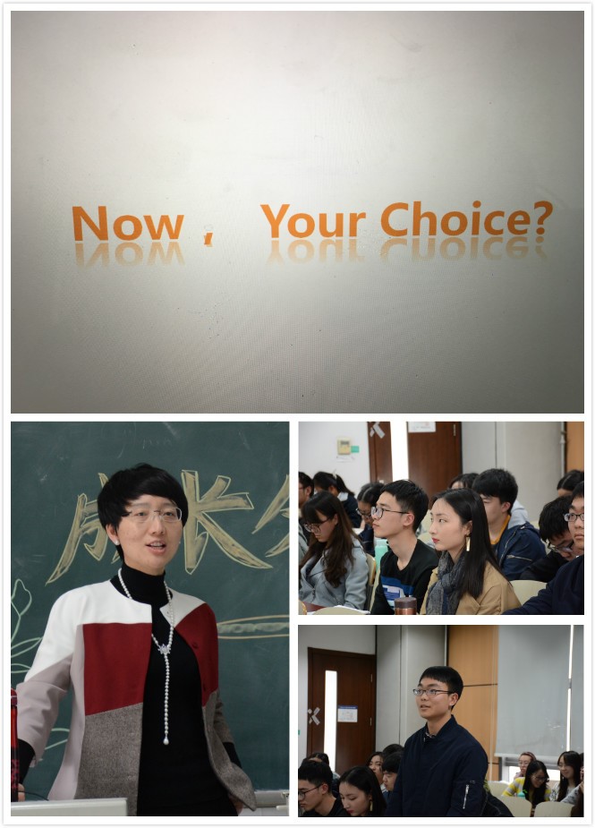 两个小时的分享会在不知不觉中走向了尾声,雷老师提出了对学生们的期望:人生中选择不断,决策也无处不在,大家不应该沉浸在“徘徊、迷茫、不知所措”的“自欺欺人”之中,而是应该努力将“人生目标与路径选择目标相统一,将知情知境与知己知彼相匹配,心怀愿景,选择深造亦或就业,在实现小我的基础上也能够仰望星空,朝着自己的梦想坚定不移的前行。”