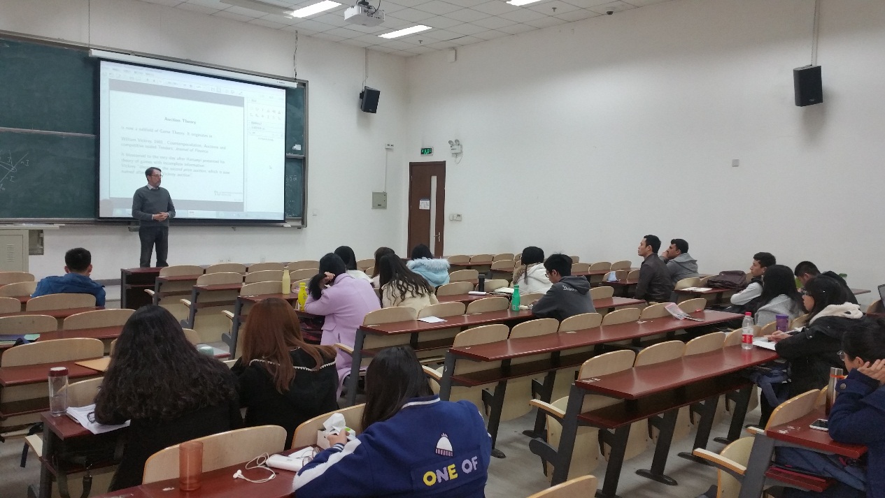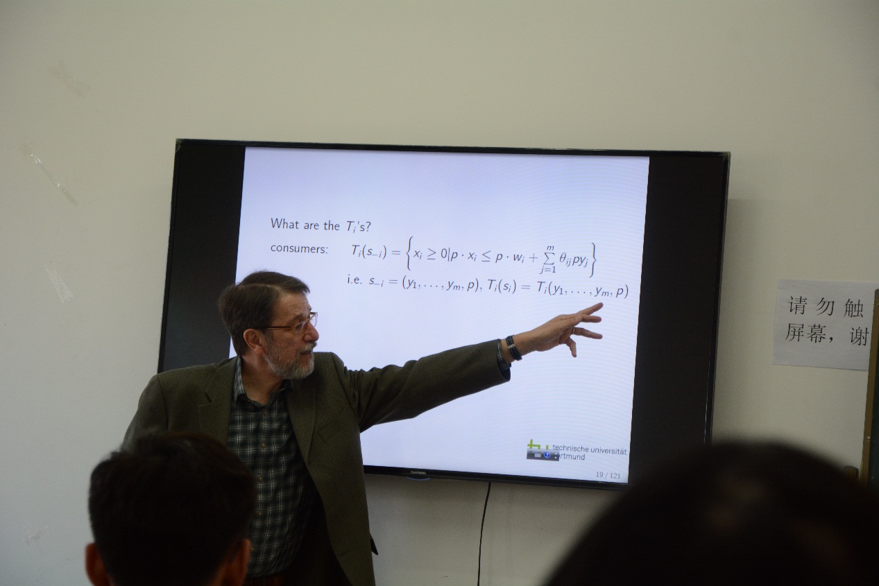 在第一次课程中,教授对经济学的方法论进行了高屋建瓴的阐述,不仅从经济学历史角度讲解了经济发展过程中一般均衡理论的发展脉络,梳理了历次诺贝尔获奖的经济学家,而且从博弈论以及拍卖理论角度阐述了获得诺贝尔奖的经济学家的主要贡献。并对二者进行了对比。从经济学学角度的介绍,给听众带来了非常宏观的经济学研究视角,对百年来经济学发展的深入理解和独特眼光,令人深为敬佩。Leininger教授是德国鲁尔必赢国际437官网的主要负责人,经常在主要的学术会议上进行精彩评论。Leininger教授的此次精彩演讲向我们展现了德国教授深刻的理论积淀和广博的学识。
