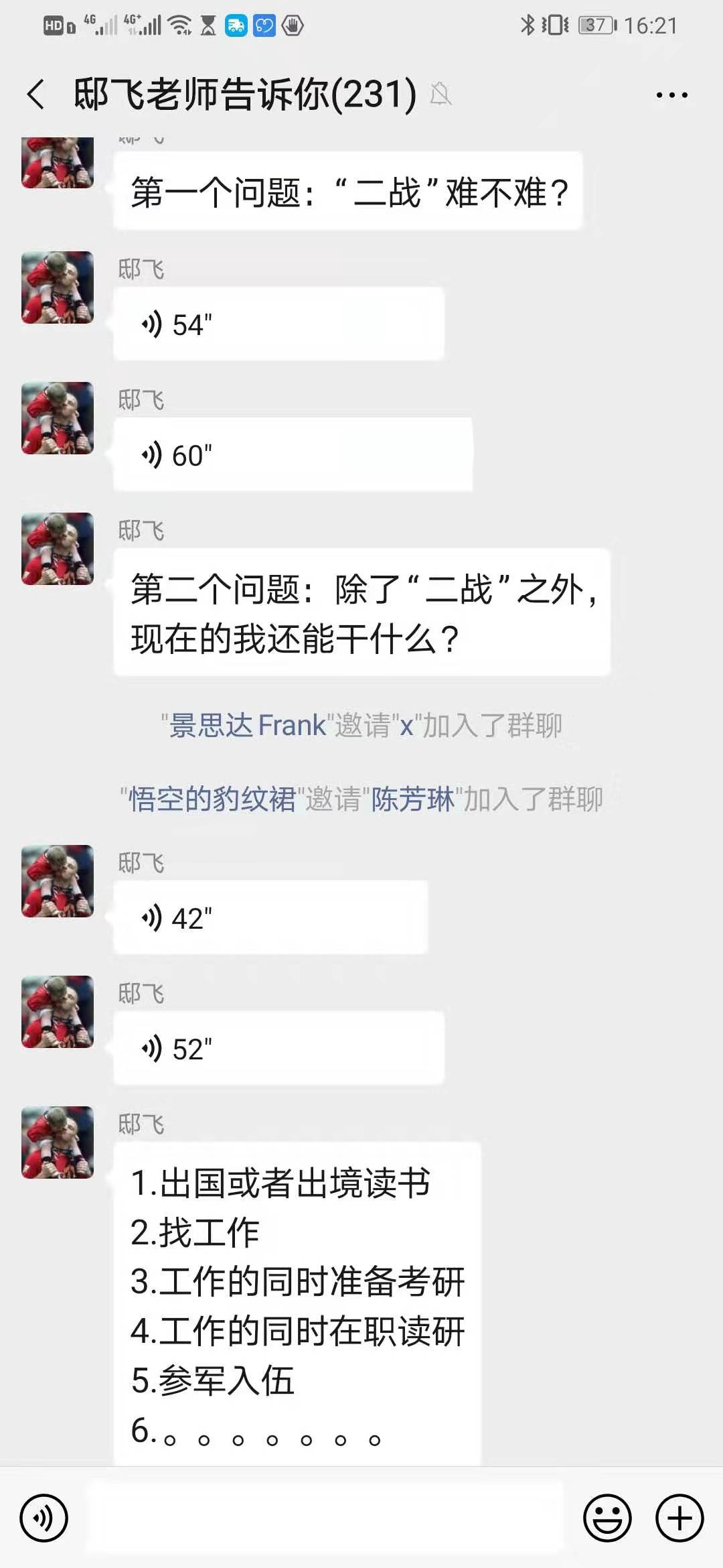 2020年1月8日18:30,微信课题正式开始。邸飞老师先就本科毕业班同学提出的两个问题:“二战”难不难?除了“二战”之外,现在马上进入春招的我还能干什么?进行了耐心细致的分析。他用数据和事实向大家说明了考研的现状:在此基础上,邸飞老师回答了第二个问题,放在本科毕业生面前的有很多路,出国(境)留学,找工作、工作期间在职读研、参军入伍等等。邸飞老师在多年的就业指导工作中经历了许多虽然考研失败但及时调整思路实现华丽转身的例子,也向同学们进行一一分享。
