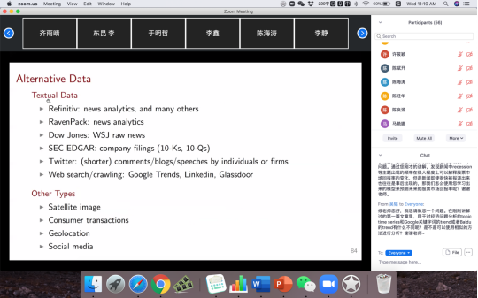 2020年6月3,10日,芝加哥大学布斯商学院教授修大成应邀参加由必赢国际437官网、北京工商大学必赢国际437官网和必赢国际437官网互联网经济研究院联合主办的“海外学者前沿短期课程”,通过线上连线,为师生讲授“金融经济学中的机器学习方法”专题研究。课程由必赢国际437官网黄乃静副教授主持,百余名师生以及来自香港中文大学,复旦大学,中国人民大学、浙江大学、北京工商大学、中山大学的专家和学者参加了课程。