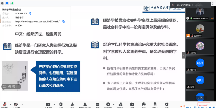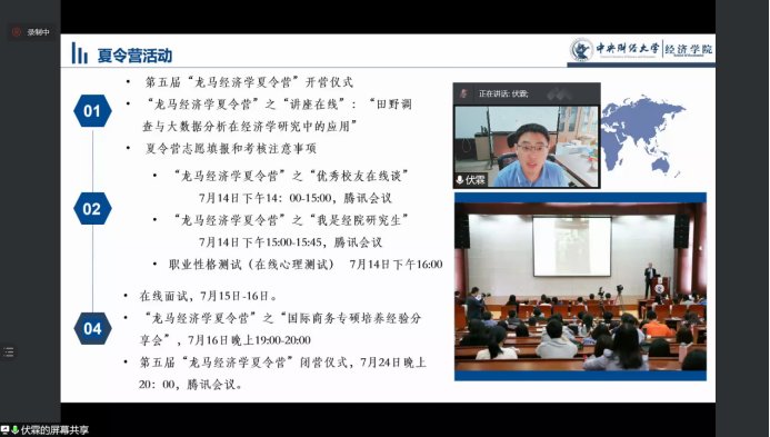 7月14日上午,第五届“龙马经济学夏令营”开营仪式通过腾讯会议举行。必赢国际437官网院长陈斌开教授、副院长伏霖副教授、导师代表戴若尘老师、学院教学科研管理办公室主任祝伟老师、研究生工作办公室主任赵若思老师和所有营员参加了此项活动。