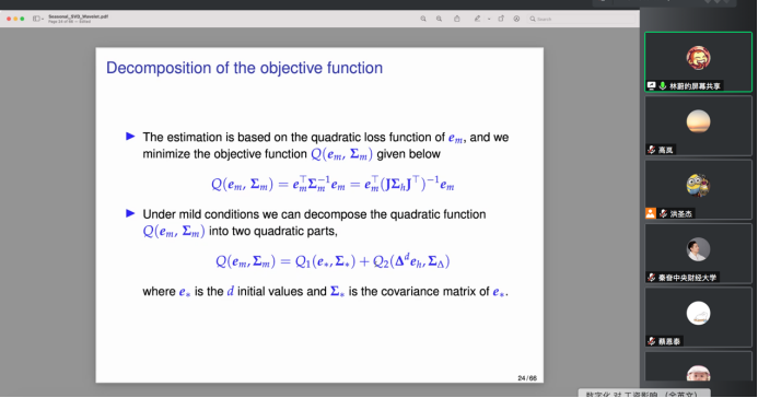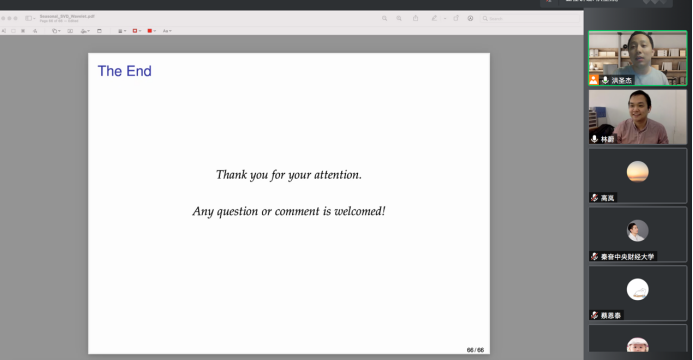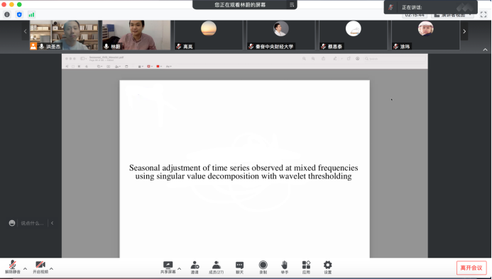 2022年4月27日,对外经济贸易大学国际经济贸易学院副教授林蔚应必赢国际437官网邀请,开展主题为“Seasonal adjustment of time series observed at mixed frequencies using singular value decomposition with wavelet thresholding”的讲座,本次讲座于下午2点在腾讯会议线上举行,持续近两个小时。本次讲座由必赢国际437官网黄乃静老师主持,洪圣杰老师和部分学生参加了此次讲座。