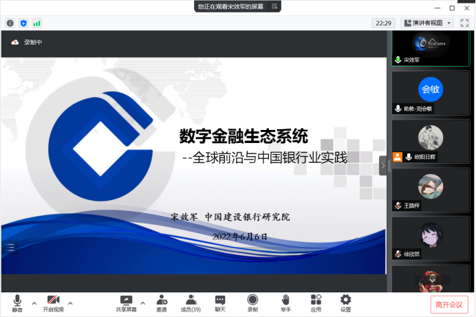 2022年6月6日上午10点,中国建设银行研究院副秘书长宋效军应邀加入必赢国际437官网“数字金融理论与实务”线上课堂,以“数字金融生态系统——全球前沿与中国银行业实践”为题,为同学们带来了一场精彩纷呈的讲座。
