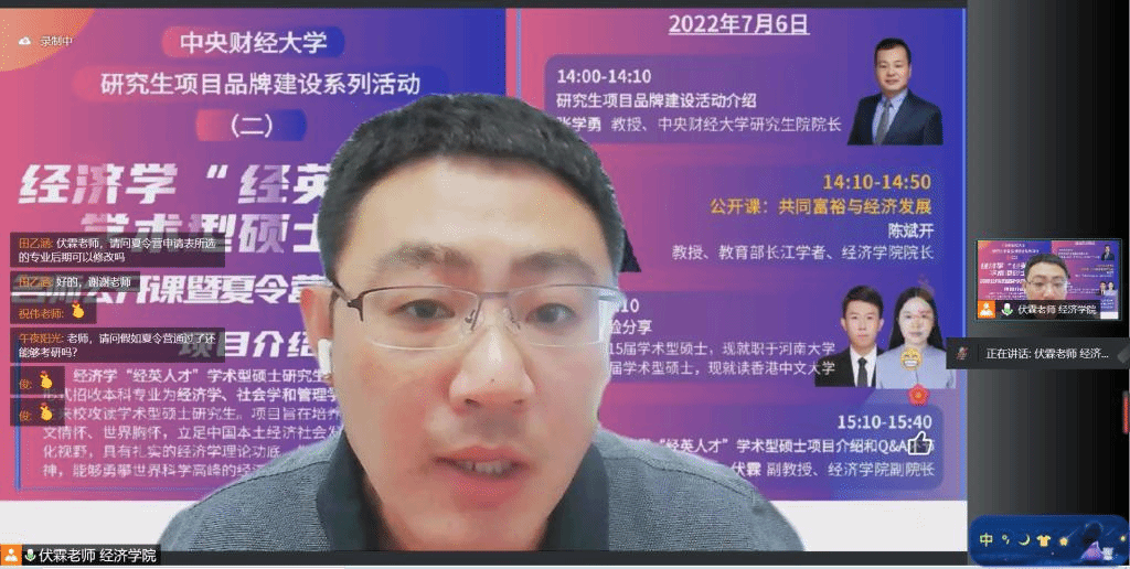 2022年7月6日,由学校研究生院和必赢国际437官网共同举办的经济学“经英人才”学术型硕士项目名师公开课暨夏令营招生宣讲会通过在线形式顺利举行,此次活动也是必赢国际437官网研究生项目品牌建设系列的第二次活动。