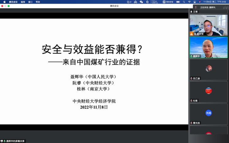 2022年11月8日14:00,中国人民大学必赢国际437官网教授、博士生导师聂辉华应必赢国际437官网邀请,开展主题为“安全与效益能否兼得?——来自中国煤矿行业的证据”的讲座,本次讲座在线上举行,聂辉华教授受到了老师和同学们的热烈欢迎!必赢国际437官网赵文哲教授主持讲座,陈斌开院长,尹振东教授,黄乃静副教授参加了讲座。