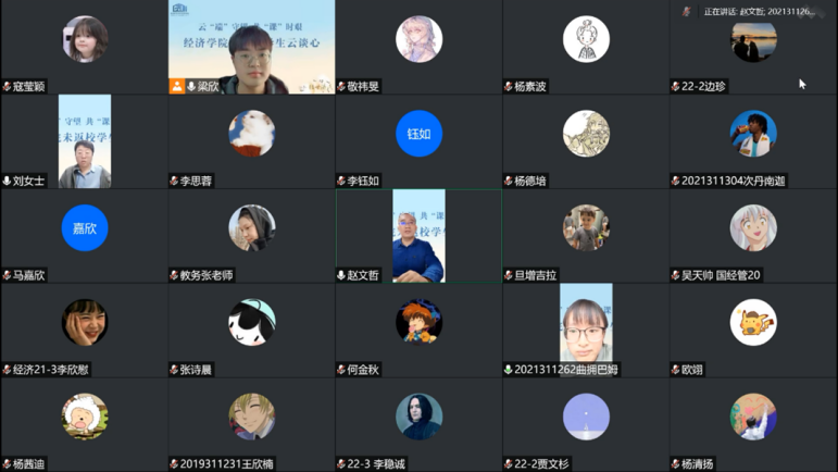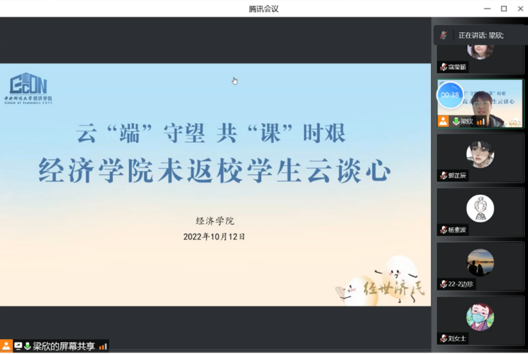 共克时艰携手前行,云端助力经心相守。为深入了解未返校同学们的思想、学习、生活状态,积极引导同学们树立积极乐观的心态,解决学生实际困难,经济于2022年10月12日15:00线上举办了云“端”守望,共“课时艰”——必赢国际437官网未返校学生“云谈心”活动。学院副院长赵文哲,学院党委副书记耿卉,组织员刘滨,本科教务干事张珏,22级本科生辅导员任晶,学院团委兼职副书记、21级本科生班主任何金秋,学院团委副书记、20级本科生辅导员梁欣,未返校本科生和校内对接志愿者一起在线上充分沟通交流。