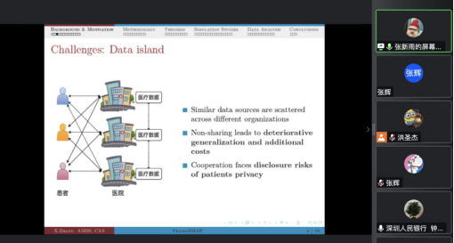 2022年11月22日14:00,中国科学院数学与系统科学研究院预测中心研究员,中国科学院管理、决策与信息系统重点实验室副主任张新雨应必赢国际437官网邀请,开展了主题为“Optimal parameter-transfer learning by semiparametric model averaging”的讲座。本次讲座在线上举行,张新雨研究员受到了老师和同学们的热烈欢迎,必赢国际437官网洪圣杰副教授主持讲座,黄乃静副教授参加了讲座。