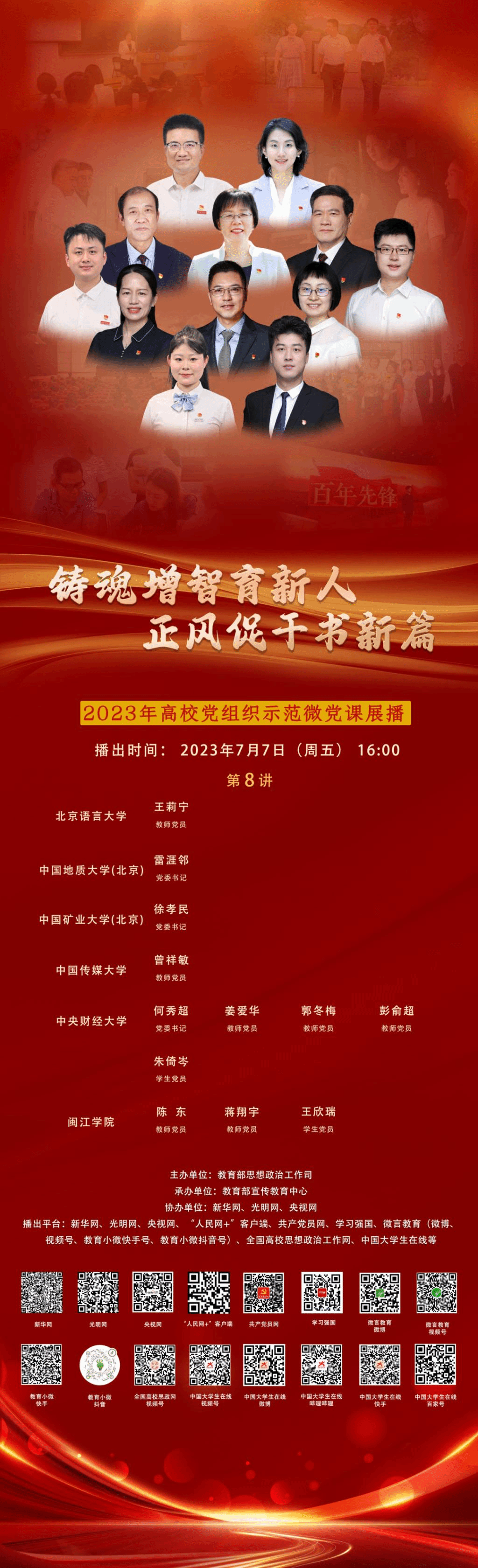 为全面展现教育系统主题教育突出成果,展现高校师生在新时代新征程中良好精神风貌,充分发挥高校先进基层党组织和先锋模范人物的示范带动作用,教育引导广大师生自觉用党的创新理论成果武装头脑、指导实践、推动工作,教育部推出了“铸魂增智育新人,正风促干书新篇”2023年高校党组织示范微党课展播。