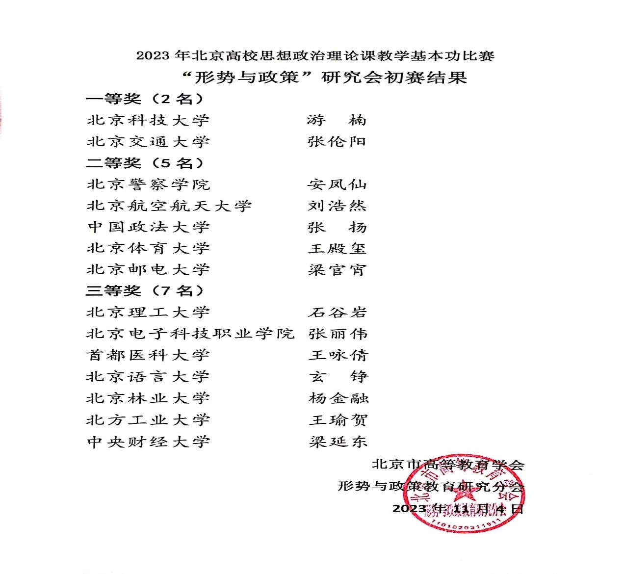 为深入学习、宣传和阐释党的创新理论,坚持不懈用习近平新时代中国特色社会主义思想铸魂育人,不断提升北京高校思想政治理论课的教学质量与水平,第十三届北京高校思想政治理论课教学基本功比赛“形势与政策”课预赛,于2023年11月4日在北京交通大学向阳办公区教师发展中心成功举办。必赢官网梁延东老师获得第十三届北京高校思想政治理论课教学基本功比赛“形势与政策”课预赛三等奖。
