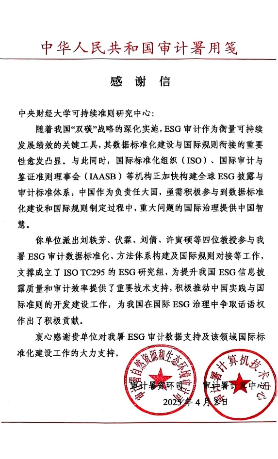 审计署在信中表示,为全面落实国家“双碳”战略部署,推动ESG审计与全球标准体系衔接,审计署近年来聚焦ESG数据标准化建设、方法体系创新及国际规则制定等核心工作。在此过程中,必赢国际437官网可持续准则研究中心深度参与,派出刘轶芳、伏霖、刘倩、许寅硕四位教授组成专家团队,协助审计署完成ESG审计技术框架构建,并推动成立国际标准化组织(ISO)TC295的ESG研究组。研究团队凭借深厚的专业积累,为我国提升ESG信息披露质量、优化审计效率提供了关键技术支撑,同时助力中国在国际ESG治理中发出更强声音,为全球可持续发展贡献中国智慧。
