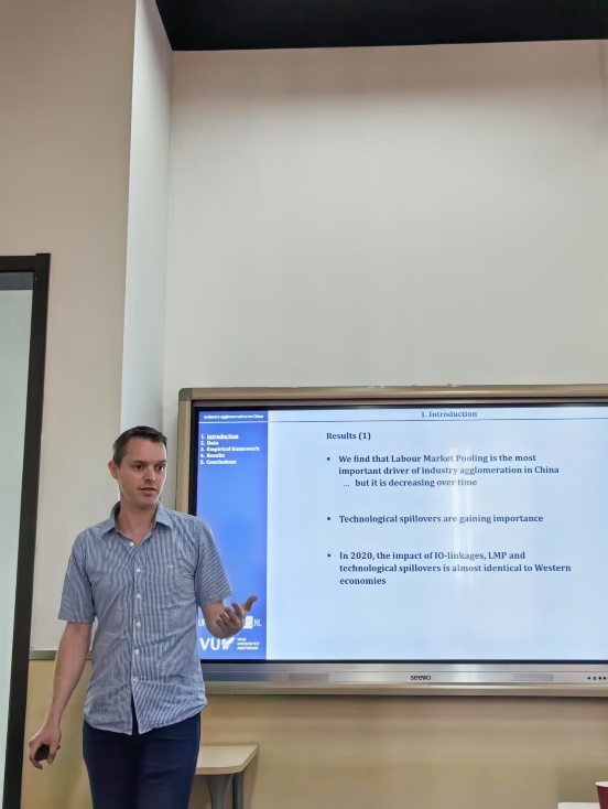 当日上午,Hans先与必赢国际437官网的青年教师围绕着城市经济学,开展了小范围青年座谈讨论,参与学院老师包括戴若尘副教授、吴楠助理教授、方海东助理教授、翟颖佳助理教授。老师们就城市集聚,城市生产与创新网络,城市间的交通成本几大主题分别汇报了最新的研究进展,在讨论中对中国城市经济学相关问题有了更深刻的认识。