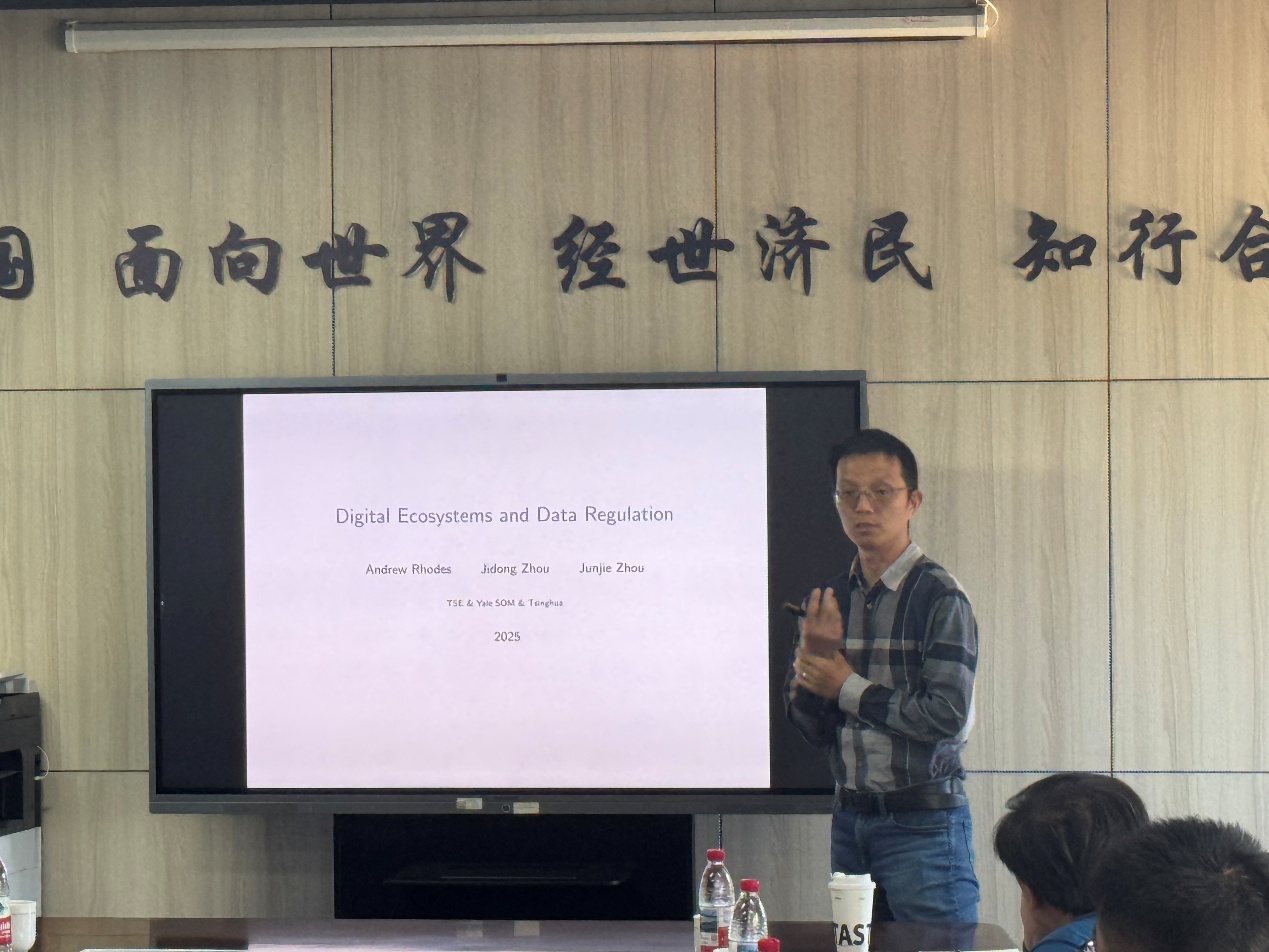 4月24日周四下午,必赢国际437官网“龙马经济学双周学术论坛”在沙河校区学院楼11号楼308会议室举行。此次讲座邀请到清华大学经济管理学院周俊杰教授,分享题为“Digital Ecosystems and Data Regulation”的研究,讲座必赢国际437官网尹振东教授主持讲座,必赢国际437官网多位老师和三十余名学生参加了此次讲座。