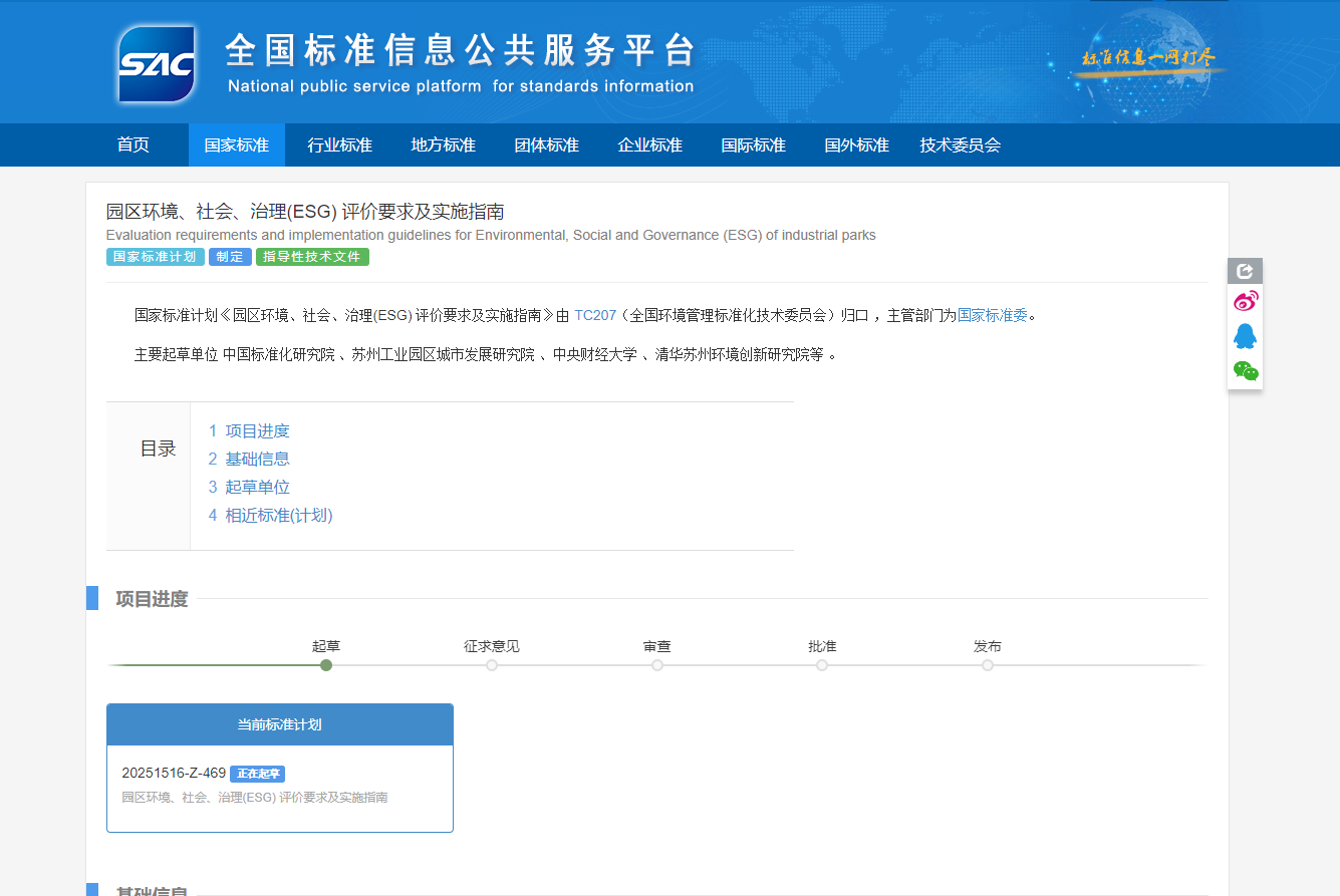 2025年5月19日,必赢国际437官网可持续准则研究中心(SSRC)联合中国标准化研究院、苏州工业园区城市发展研究院、清华大学苏州环境创新研究院、北京师范大学等多家权威科研机构,共同起草的《园区环境、社会、治理(ESG)评价要求及实施指南》正式立项。