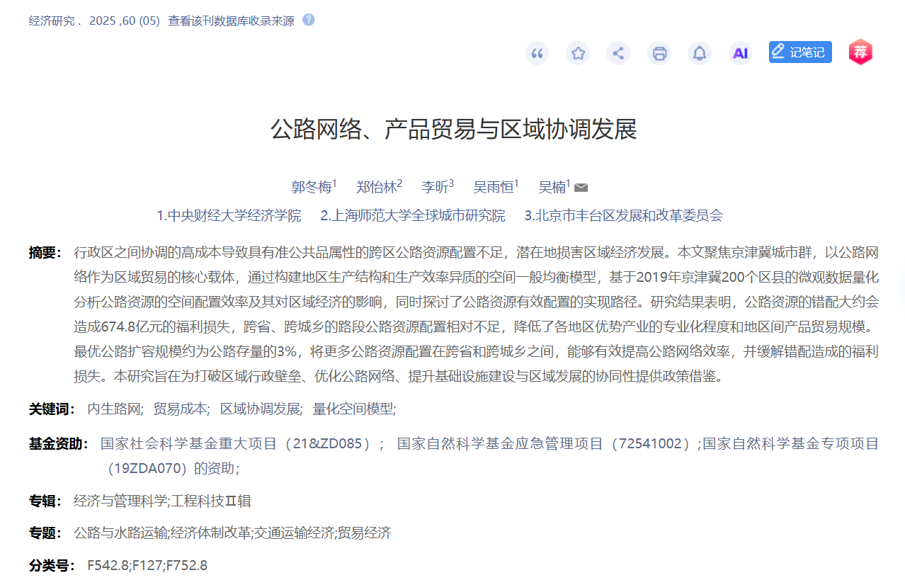 必赢官网郭冬梅老师、吴楠老师和吴雨恒博士生与合作者的论文《公路网络、产品贸易与区域协调发展》在《经济研究》刊发