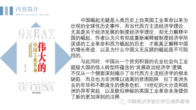 接着,李朗睿同学带来了他对《伟大的中国工业革命》这本书的思考与感悟。该书中最重要的理论就是经济发展的“胚胎发育理论”,在这个理论中重商主义、市场与政府扮演着非常重要的角色。作者反复强调市场不是免费的,而是一件昂贵的公共品,而市场缺失和市场创造者缺失是经济发展的首要问题和关键问题,并且政府在克服社会协调失灵和“市场创造”巨大成本方面起着核心作用。同时,在工业化的进程中,循序渐进的经济改革政策和发展战略对于国家工业化成败是最为关键的,政治制度和经济制度是内生的,是被建立来实现或执行国家发展政策和战略的工具,是用来巩固经济发展成果的体制化保障。作者强调工业化必须按顺序经历几个主要且独特的阶段,在每个阶段都面临着不同的市场缺失和市场创造者缺失的问题。因而,发展问题并不能通过一次性“供给侧”的“大推进”,而是经过许多轮自下而上、用市场需求来驱动创造供给、按次序进行产业升级才能良态进行。