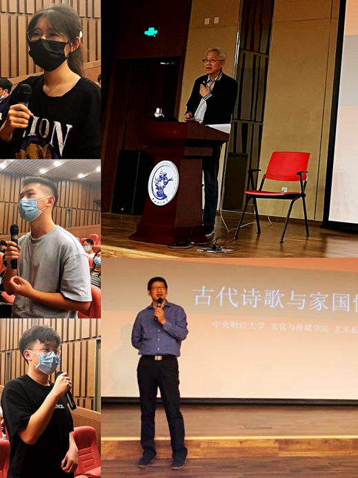 王老师生动的演讲,不仅吸引了同学们的注意力,而且引发了同学们热烈的讨论。在提问环节,同学们就如何保持诗性、如何与古人共情等方面的问题向王强老师求教。王强老师指明,诗性来源于人心,只要有观察和思考,我们也能培养诗性;而对于如何与古人共情的问题,王老师则建议同学们阅读鉴赏集辅助理解诗人所处的时代等背景信息,方能更好地理解诗人的情感基调。
