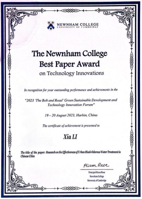 中心研究生李霞博士执笔,中国环境科学研究院流域中心高红杰副主任、流域中心流域水生态保护与修复研究室袁鹏主任及中心研究部刘倩主任、必赢国际437官网财经研究院李珊珊副研究员共同合作完成的研究论文《Research on the Effectiveness of Urban Black-Odorous Water Treatment in Chinese Cities》,在“2023一带一路绿色可持续发展与科技创新论坛”上获评杰出论文奖。李霞博士到场宣讲论文,并接受点评和颁奖。